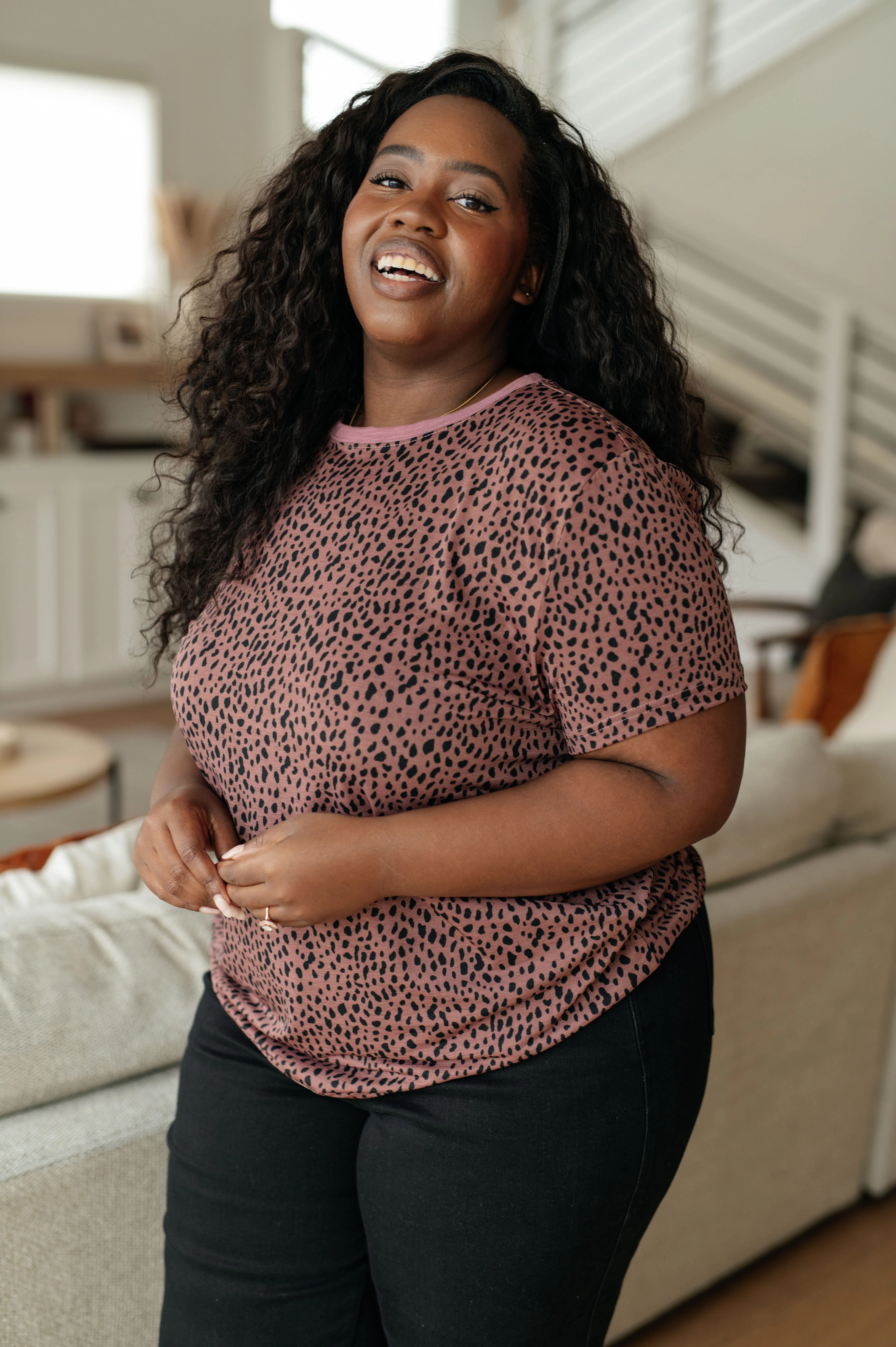 This Cheetah Girl Short Sleeve Top is the perfect statement piece to spruce up any wardrobe. The lightweight Bulgari fabric is easy to wear will keep you comfortable all day long. The contrasting pink trim at the neckline and relaxed fit will bring an edgy look to any outfit. Show off your wild side in style!
