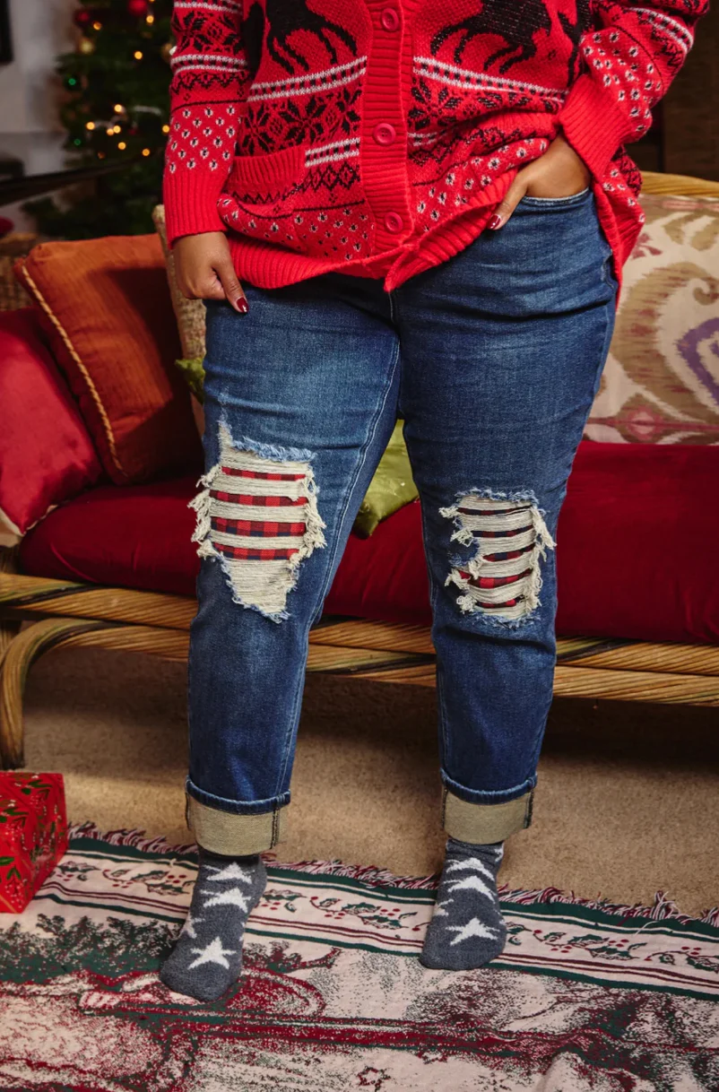 Judy Blue “Charlotte” MidRise Buffalo Plaid Patch Destroyed Boyfriend Jeans